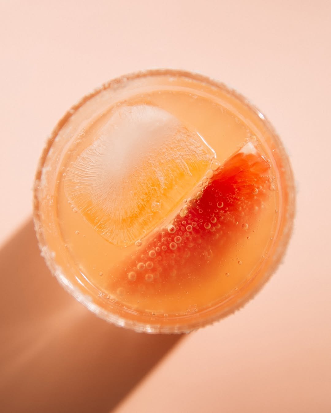 Start by pouring a bit of salt onto a small plate. Rub a grapefruit wedge around the rim of your glass, then roll the rim of the glass around the salt.
